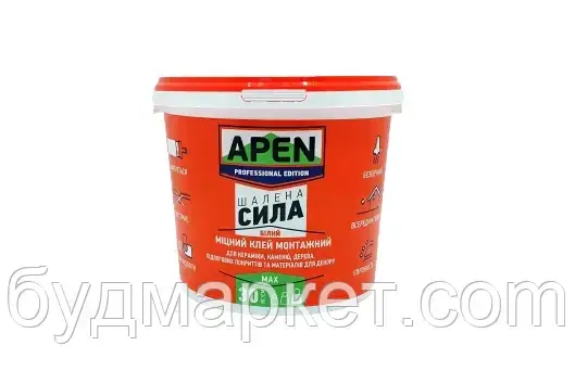 APEN ШАЛЕНА СИЛА - Суперсильний монтажний клей розроблений для приклеювання важких конструкцій. Спеціальна формула дозволяє значно збільшити адгезію до більшості будівельних матеріалів, таких як цегла, бетон, гіпсокартон, твердий ПВХ, вироби з деревини.
